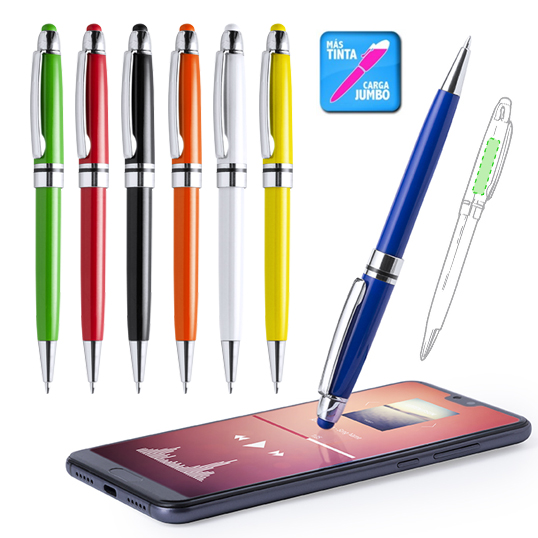 Bolígrafo puntero de colorido diseño, con cuerpo en vivos colores brillantes a juego con el puntero. De mecanismo pulsador, con detalles cromados y clip metálico. Cartucho jumbo y tinta azul. Carga Jumbo