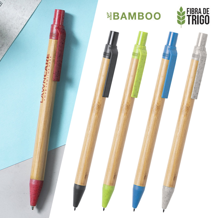 Bolígrafo de línea nature y mecanismo pulsador. Cuerpo fabricado en bambú, con accesorios en caña de trigo, para así fomentar la utilización de materias primas naturales y reducir las emisiones contaminantes. Con tinta azul y disponible en variada gama de colores. Distintivo caña de trigo en la parte superior del bolígrafo.