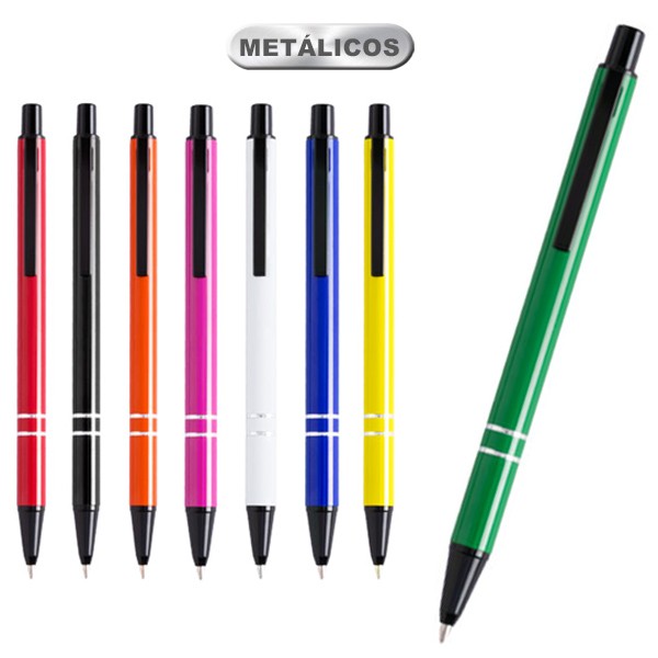 Bolígrafo de mecanismo pulsador en original diseño bicolor. Con cuerpo en aluminio de suave acabado en alegres colores. Accesorios en color negro y anillas en plateado. Tinta azul.