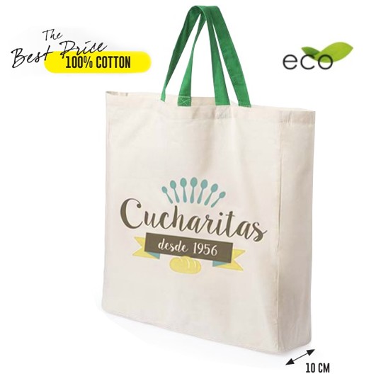 Bolsa en material 100% algodón orgánico con acabado en color natural. Con asas cortas reforzadas de 35cm en color verde, fuelle y acabado cosido. Resistencia hasta 9kg de peso.