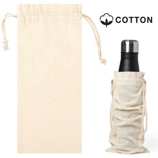 Bolsa de línea nature en material 100% algodón de 105g/m2. Tamaño 12x33 cm, de acabado cosido y con cordones autocierre de algodón. Especialmente diseñada para packaging en botellas y termos.