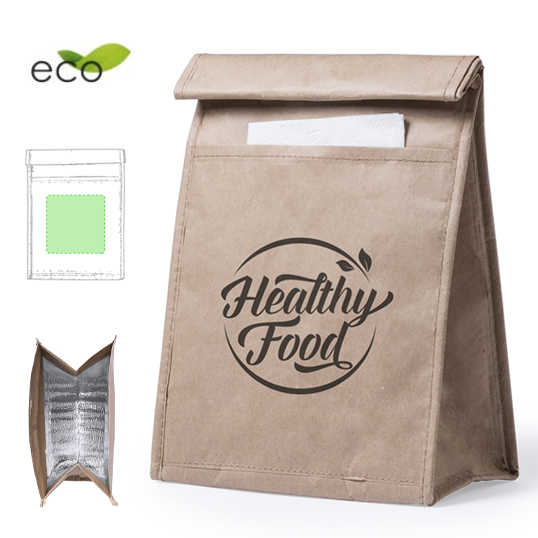 Bolsa térmica en papel resistente a la humedad de 85g/m2. Con interior isotermo acabado en aluminio, bolsillo exterior y cierre de velcro. 2,3 litros de capacidad.