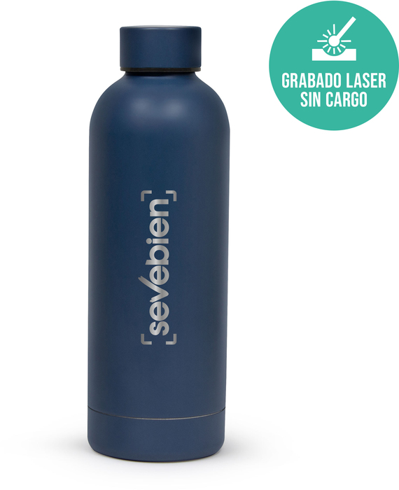 Ø 7.4 x 22 cm. Capacidad 500 ml. Acero inoxidable. Botella doble pared, sellada al vacío. Interior en acero 304 y exterior en acero 201. Mantiene hasta 12 hs la temperatura de las bebidas calientes y 24 hs de las bebidas frías. Presentación en caja de regalo.