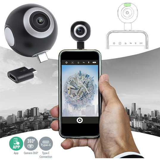 Cámara 360° con conexión Tipo-C y adaptador micro USB para dispositivos móviles Android. De alta calidad de captura de vídeo 360° con resolución HD 2048x1024p, especialmente diseñada para uso intensivo. APP disponible para disfrutar de los vídeos filmados en 360° en gafas de realidad virtual compatibles -no incluidas-. Presentada en atractiva caja de diseño. Conexión Micro USB y Tipo C