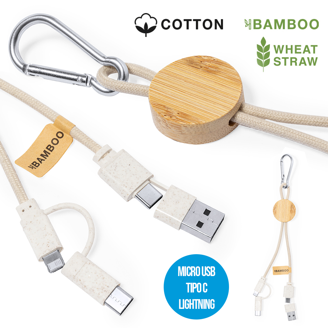 Cable cargador con mosquetón de transporte. Fabricado usando materiales naturales y respetuosos con el medio ambiente:Pieza central en bambú natural.Cables recubiertos de algodón, incluyen conexiones de entrada Tipo C y USB, salidas Lightning, Micro USB y Tipo C. 5V DC 2.4A.Presentado en bolsa individual de diseño kraft. Poner que lleva distintivo en hangtag de bambú y algodón kraft.Elaborado con elementos vegetales para así fomentar la utilización de materias primas naturales y reducir las emisiones contaminantes. Conexión Micro USB, Tipo C y Lightning 5V DC 2.4A