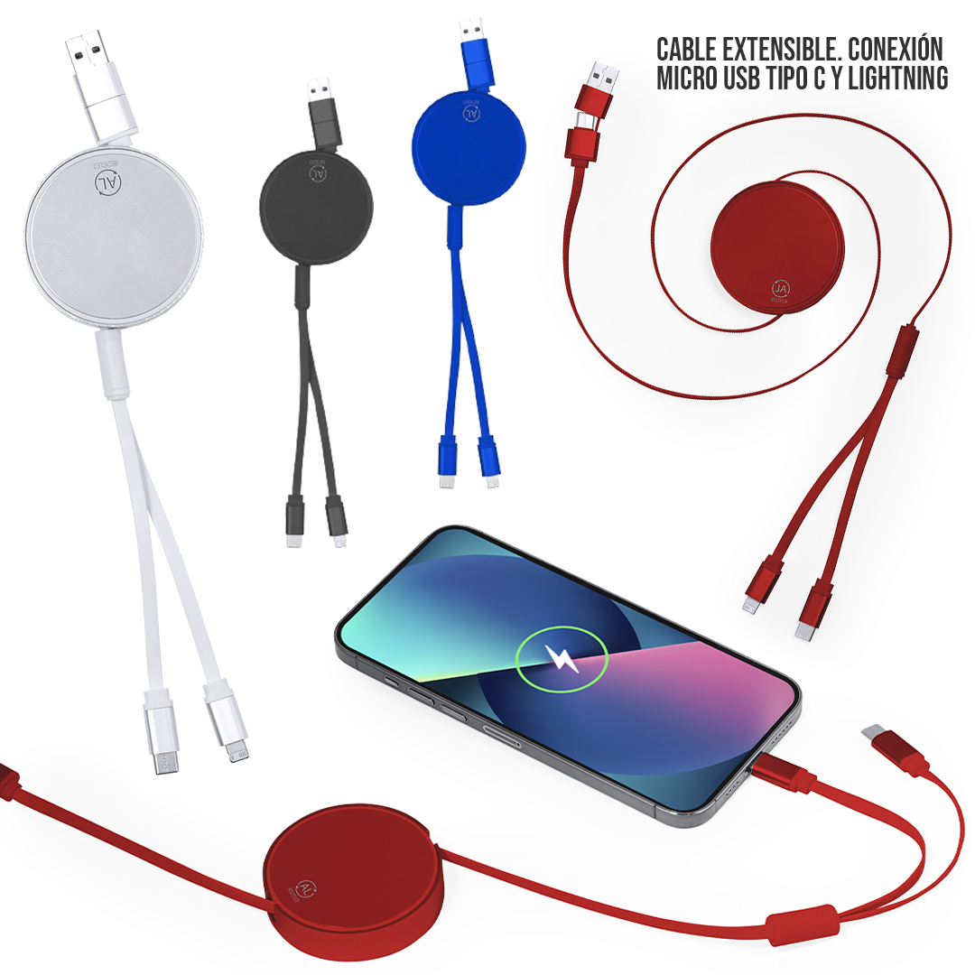 Cable cargador y sincronizador extensible, apto para transferencia de datos y fabricado en Aluminio Reciclado de acabado metalizado. Carcasa central con amplia superficie de marcaje, especialmente diseñada para grabado en láser. Disponible en variada gama de colores, con cables a juego. Conexiones de entrada Tipo C y USB, con salidas Lightning, Micro USB y Tipo C. 5V DC 2.4A. Presentado en bolsa individual de diseño kraft. Apto para transferencia de datos. El Aluminio Reciclado es un material con posibilidades de reciclaje casi infinitas, sin perder sus propiedades originales y consumiendo menos energía en este proceso. Certificación GRS (Global Recycled Standard / Estándar de Reciclaje Global), que garantiza el origen reciclado del material usado para fabricar el producto. Cable Extensible. Conexión Micro USB, Tipo C y Lightning 5V DC 2.4A