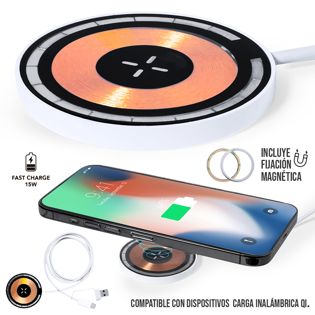 Cargador inalámbrico 15W en distintivo diseño transparente. Comodidad y eficiencia, con sistema de carga de última generación y compatible con dispositivos con tecnología Qi. Su superficie de carga junto a la tecnología Magsafe garantizan una conexión segura y estable. Conexión Tipo C, con manual de uso en español e inglés. Presentados en caja individual de diseño kraft.Fabricado conforme a los estándares RoHS y en cumplimiento con los siguientes requisitos de seguridad:Sistema de protección contra sobrecalentamiento.Sistema de protección contra sobrecarga.Sistema de bloqueo para evitar cortocircuitos. Inalámbrico 15W. Magnético