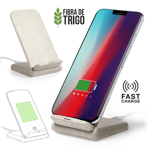 Cargador inalámbrico de línea nature con función soporte para móvil. Carcasa en caña de trigo, para así fomentar la utilización de materias primas naturales y reducir las emisiones contaminantes. Con función carga rápida de 10W y compatible con dispositivos equipados con tecnología de carga inalámbrica. Con luz indicadora de estado de carga y cable de 100 cm. Amplia superficie de marcaje, presentado en atractiva caja de diseño eco. Inalámbrico 10W