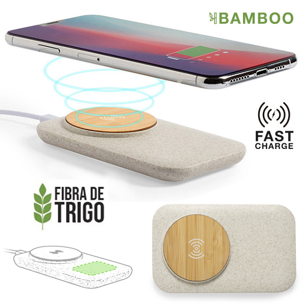 Cargador inalámbrico de línea nature. Hecho en bambú en combinación con caña de trigo, para así fomentar la utilización de materias primas naturales y reducir las emisiones contaminantes. Indicador de estado de carga y compatible con dispositivos equipados con tecnología de carga inalámbrica. Amplia superficie de marcaje y presentado en atractiva caja de diseño eco. Cable incluido. Inalámbrico 10W