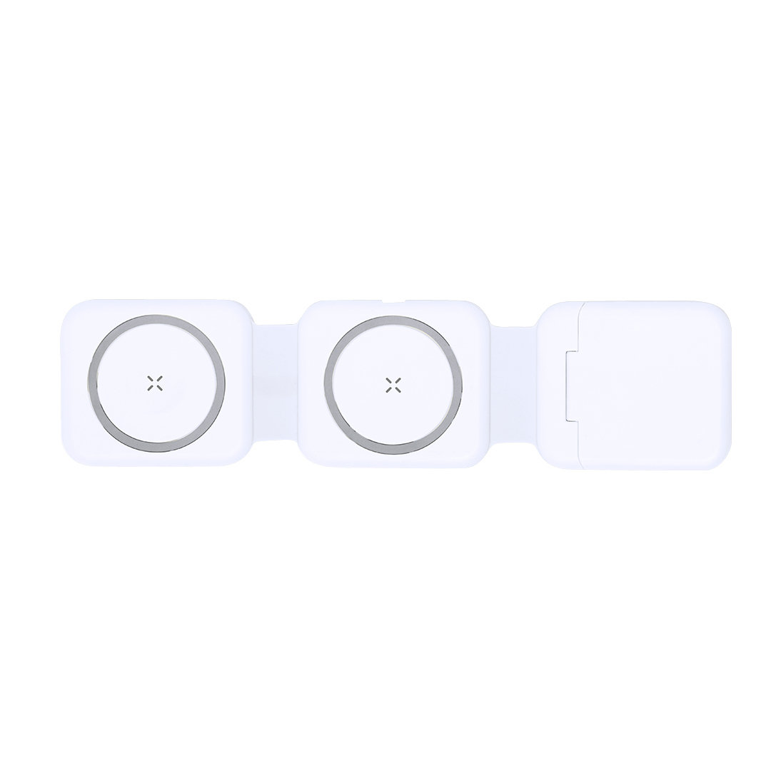 Completo cargador inalámbrico magnético 15W, diseñado para la carga simultánea del smartphone, auriculares y smartwatch. Se trata de un gadget todo en uno: plegable, portable, de tamaño compacto y muy versátil. Incluye set de cables cargadores sincronizadores -aptos para transferencia de datos- con conexiones Micro USB, Tipo C y Lightning. Además, incorpora un accesorio eyector para tarjeta SIM. Elaborado en resistente ABS de color blanco y presentado en atractiva caja individual de diseño. Disponible manual de instrucciones en español e inglés. Fabricado conforme a los estándares RoHS y en cumplimiento con los siguientes requisitos de seguridad:??Sistema de protección contra sobrecalentamiento.?Sistema de protección contra sobrecarga.?Sistema de bloqueo para evitar cortocircuitos. Set Cables Cargadores Incluido. Apto para transferir datos. Conexión Micro USB, Tipo C y Lightning 5V DC 3A. Eyector de SIM Incluido