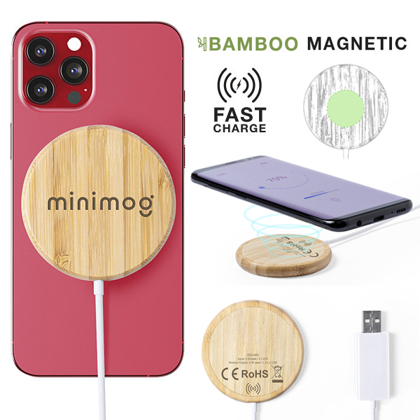 Cargador inalámbrico magnético 10W de línea nature, con carcasa fabricada en resistente bambú. Con indicador de estado de carga y cable USB de 1m. Incluye accesorio metálico con adhesivo 3M, de fijación extra fuerte y libre de residuo al despegarlo del dispositivo, permitiendo así el uso de la función magnética del cargador en cualquier dispositivo móvil. Compatible con terminales equipados con tecnología de carga inalámbrica. Amplia superficie de marcaje y presentado en atractiva caja de diseño eco. Disponible manual de instrucciones en español e inglés. Inalámbrico 10W. Magnético