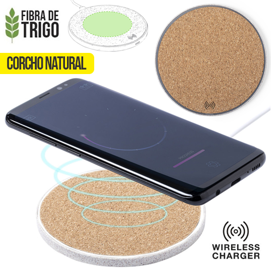 Cargador inalámbrico 10W de línea nature y diseño circular. Carcasa en combinación de materiales corcho natural y caña de trigo. Incluye cable micro USB de 1 metro de largo, con indicador de estado de carga y compatible con dispositivos equipados con tecnología de carga inalámbrica. Amplia superficie de marcaje y presentado en atractiva caja de diseño eco. Inalámbrico 10W