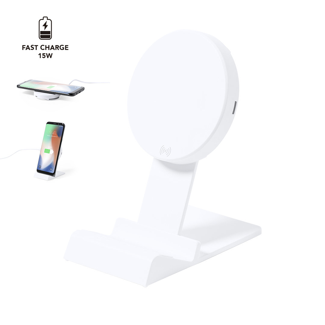 Cargador inalámbrico de carga rápida 15W. En elegante acabado blanco, con base de carga con altura regulable y función soporte para smartphone. Compatible con dispositivos equipados con tecnología de carga inalámbrica. Cable de carga Tipo C incluido, con amplia superficie de marcaje y presentado en atractiva caja de diseño. Disponible manual de instrucciones en español e inglés. En cumplimiento con los requisitos de seguridad: Sistema de protección contra sobrecalentamiento.Sistema de protección contra sobrecarga.Sistema de bloqueo para evitar cortocircuitos. Inalámbrico 15W. Altura Regulable