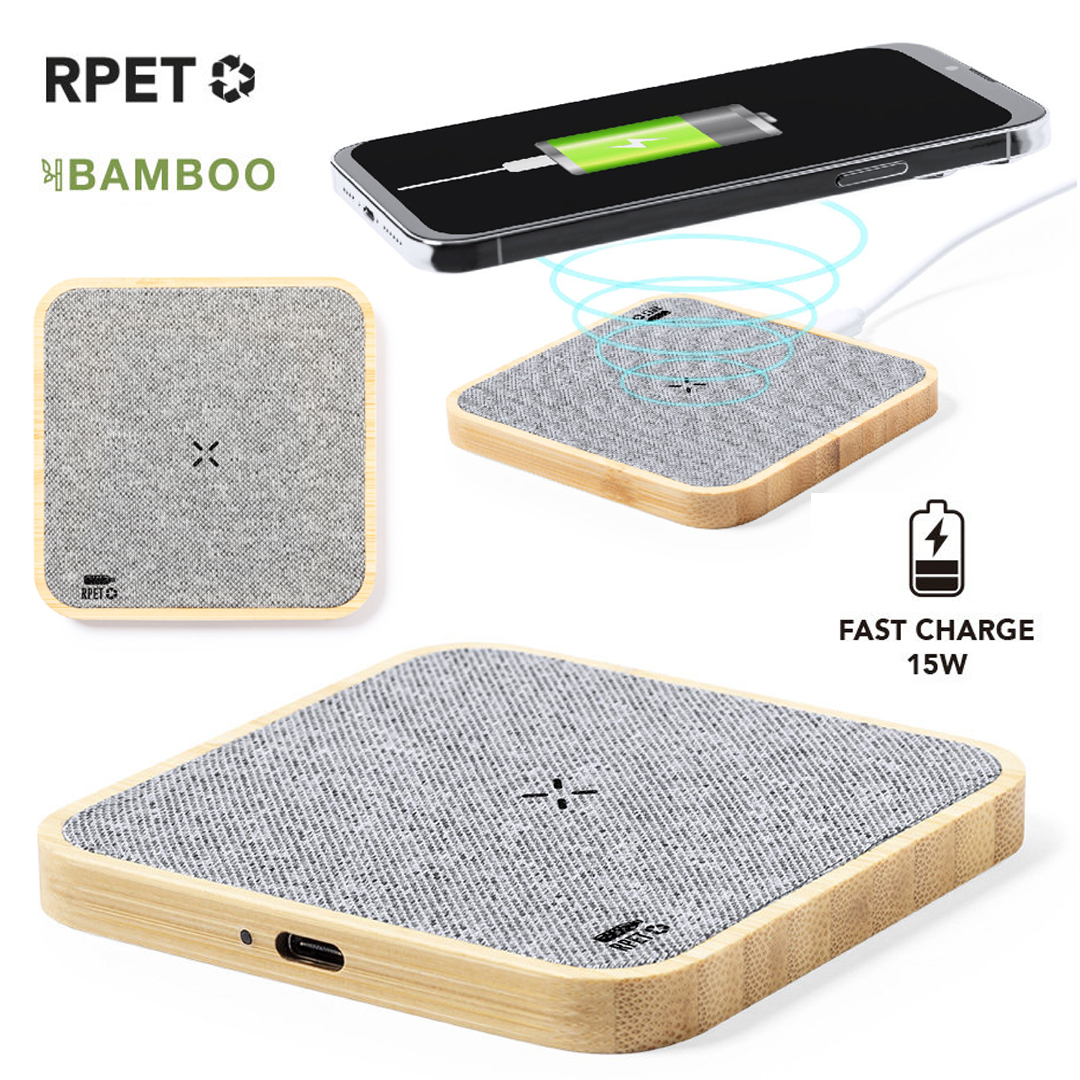 Cargador inalámbrico 15W de diseño rectangular. Fabricado en bambú y poliéster RPET, elaborado a partir de plástico reciclado, para así fomentar la reutilización de residuos plásticos y ayudar a la sostenibilidad del planeta. Compatible con dispositivos equipados con tecnología de carga inalámbrica Qi. Incluye cable cargador Tipo C y manual de instrucciones en español e inglés. Con distintivo RPET y presentado en caja individual de diseño kraft.Fabricado conforme a los estándares RoHS y en cumplimiento con los siguientes requisitos de seguridad:Sistema de protección contra sobrecalentamiento.Sistema de protección contra sobrecarga.Sistema de bloqueo para evitar cortocircuitos. Inalámbrico 15W