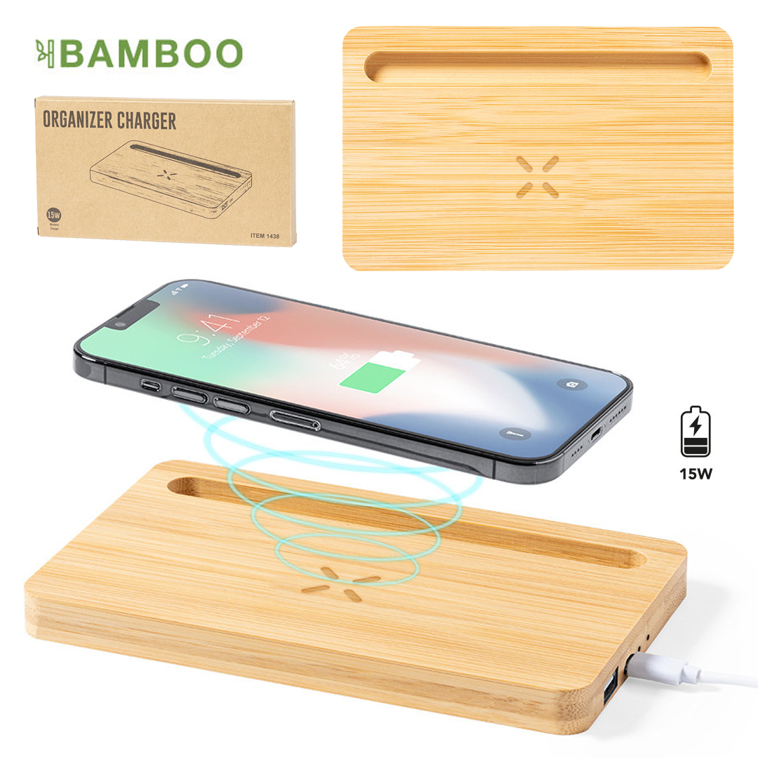Cargador organizador inalámbrico 15W de línea nature. Con función soporte para smartphone y salida USB de 2.000 mA. Permite cargar de manera simultánea hasta 2 dispositivos (1 mediante carga inalámbrica y 1 mediante cable). Hecho en bambú procedente de cortes naturales y compatible con dispositivos equipados con tecnología de carga inalámbrica. Amplia superficie de marcaje y presentado en caja individual de diseño eco en cartón kraft. Inalámbrico 15W. Salida USB