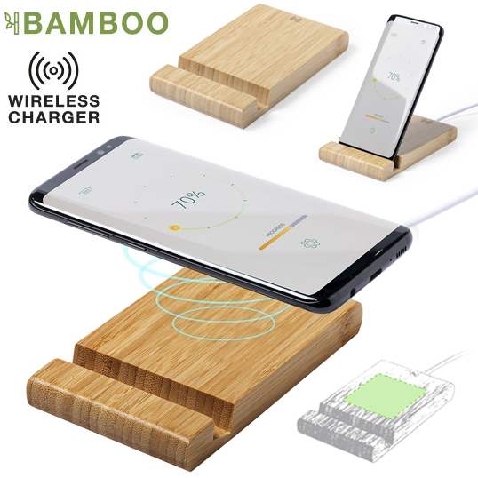 Cargador inalámbrico 15W de línea nature, con soporte integrado para smartphones y tablets. Carcasa en bambú procedente de cortes naturales. Incluye cable micro USB de 1m y es compatible con dispositivos equipados con tecnología de carga inalámbrica. Con amplia superficie de marcaje, presentado en atractiva caja de diseño eco. Inalámbrico 15W