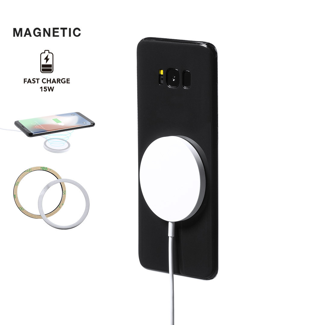Cargador inalámbrico magnético con carga de 15W.Cable con conexión USB de 1m. Accesorio metálico con adhesivo 3M, de fijación extra fuerte y libre de residuo al despegarlo del dispositivo, permitiendo así el uso de la función magnética del cargador en cualquier dispositivo móvil. Compatible con terminales equipados con tecnología de carga inalámbrica. Amplia superficie de marcaje y presentado en atractiva caja de diseño. Disponible manual de instrucciones en español e inglés. Inalámbrico 15W. Magnético