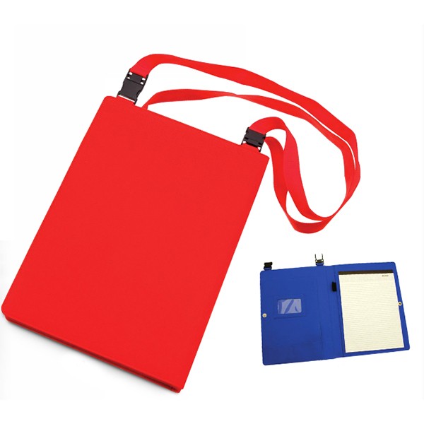 Original carpeta de poliéster 600D con cinta bandolera desmontable. Interior con bloc extraíble de 20 hojas lisas, bolsillo de solapa, tarjeteros y soporte para bolígrafo. Bloc 20 Hojas