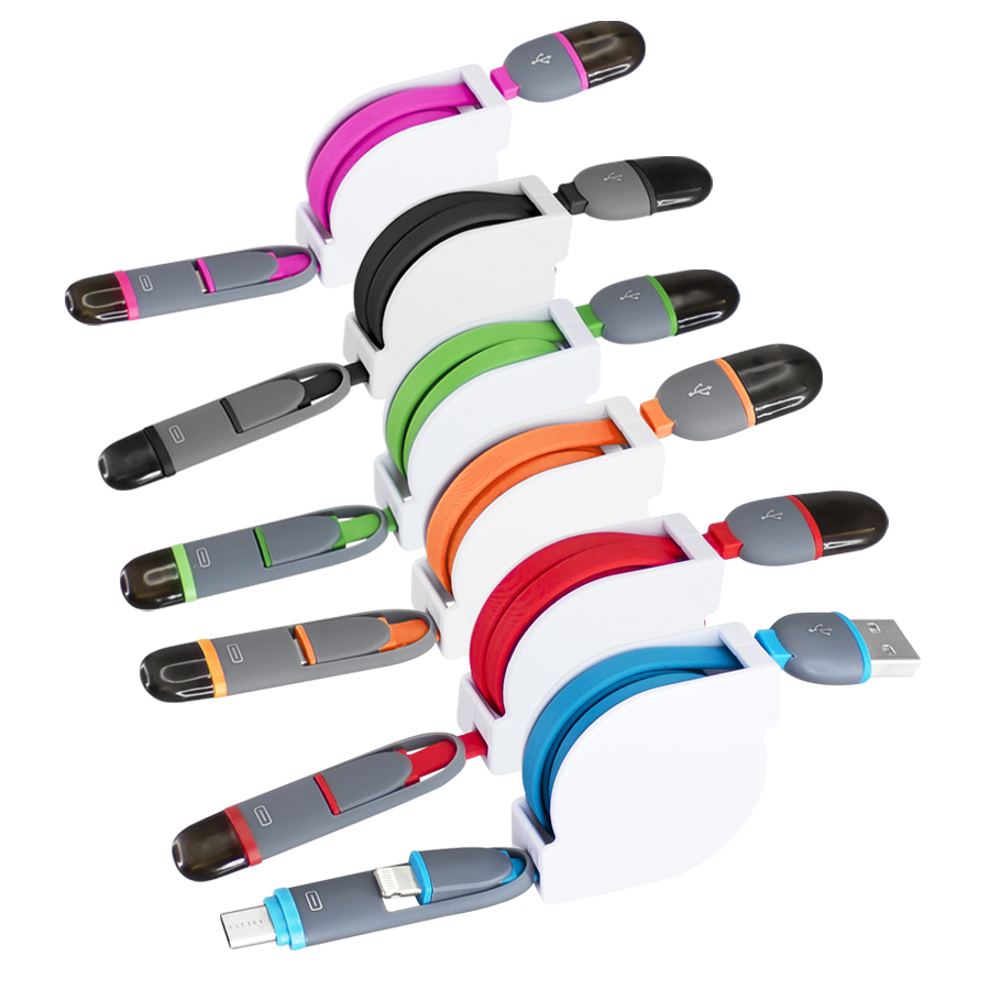 Connect Multicargador Retráctil, con cable de 1m de plástico engomado TPE de color, terminales de carga USB y Micro USB / i-phone / Type C. Incorpora nueva tecnología de cable cargador dual Micro USB y i-phone (en el mismo terminal). Compatible con dispositivos Android, Apple y Type C. Soporte plástico ABS blanco con amplia área de impresión. Presentación en elegante bolsa OPP con orificio para ganchera. Producto con aprobación CE, ROHS, FC.