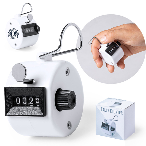 Contador de aforo manual fabricado en resistente material ABS de acabado brillo. Práctico soporte metálico para el dedo, cómodo pulsador y contador de 4 dígitos, con botón de reinicio en lado derecho. Amplia superficie lateral para logotipo y especialmente diseñado para marcaje en tampografía. Presentado en atractiva caja individual de diseño.