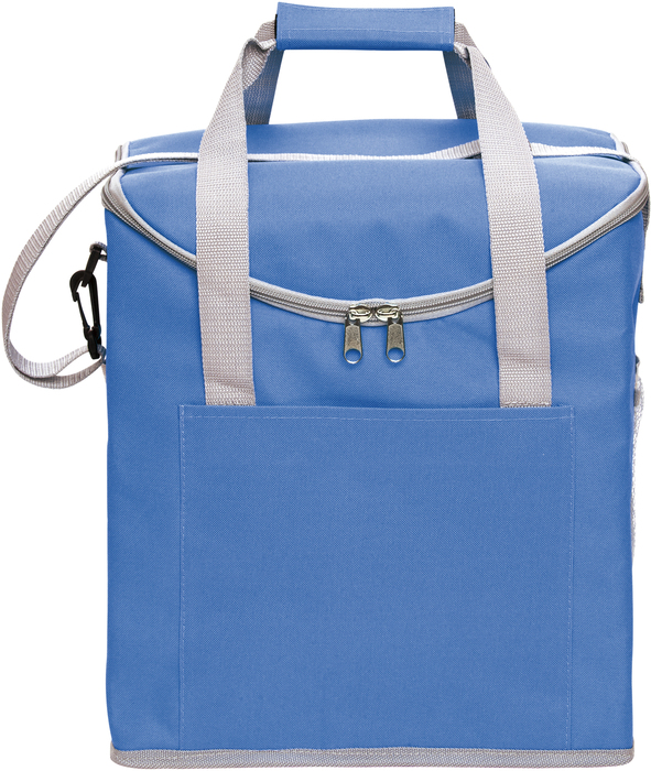 30 x 34 x 19,5 cm. Capacidad 37 litros. Poliéster. 600D Lonchera térmica con recubrimiento interior metalizado. Un bolsillo frontal y dos bolsillos laterales de red. Correa tipo bandolera y dos manijas reforzadas con cierre de velcro. Capacidad hasta 6 botellas de 2,5 litros