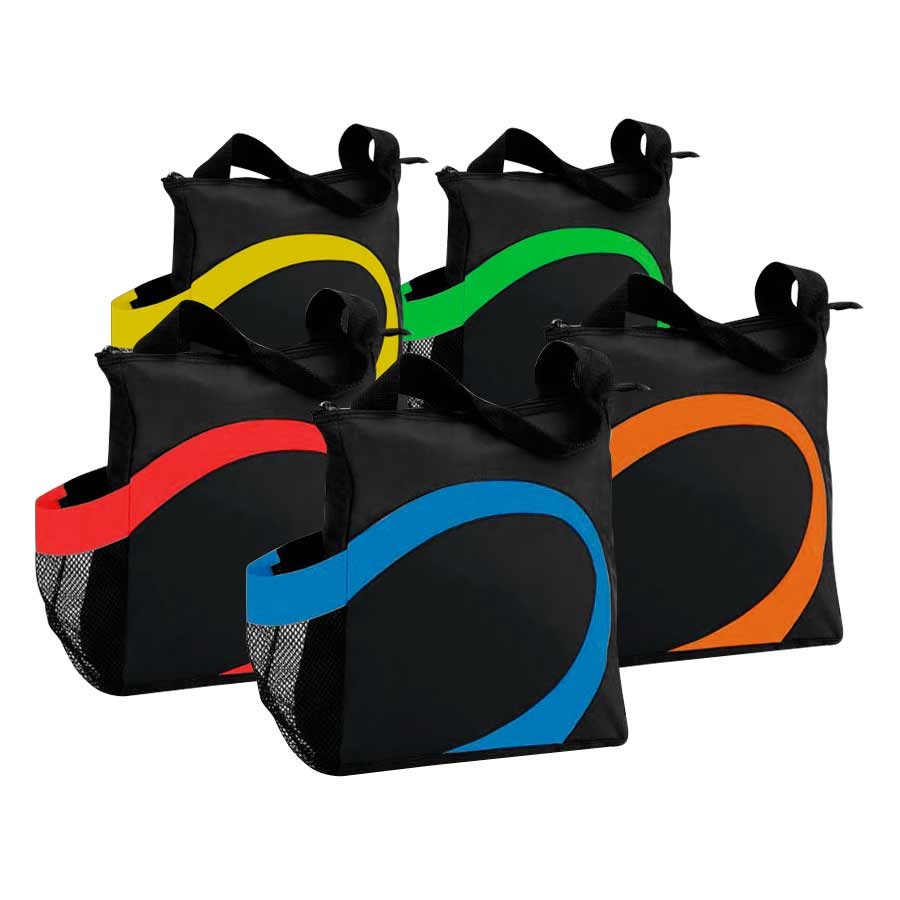 Cooler modelo "Wave". Tela exterior Polyester 70D/PVC. Tela interior plateada aislante 15C PEVA + relleno 3mm esponja PE. Cierre cremallera superior. Incluye bolsillo lateral en tela malla.