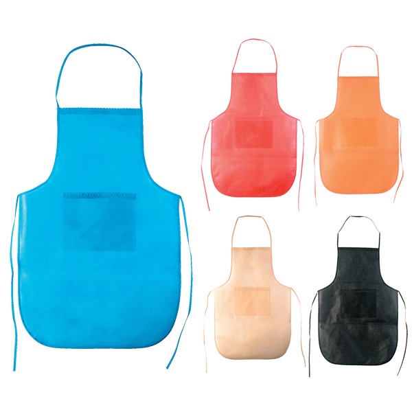 Delantal de non-woven en variada gama de vivos colores. Con bolsillo frontal y cintas de ajuste. De corte por encima de la rodilla.