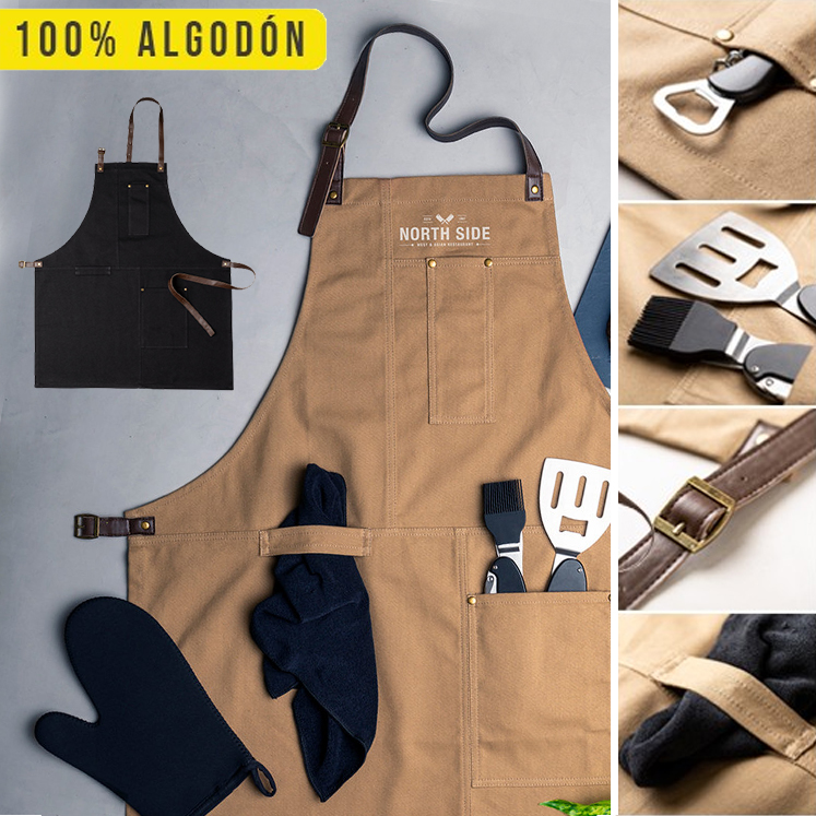 Delantal pro de alta calidad en resistente material 100% algodón canvas de 340g/m2. De corte por debajo de la rodilla, con cintas de cuello y cintura en resistente polipiel con ajuste mediante hebilla y reforzado con remaches metálicos. Incluye multitud de bolsillos para los distintos utensilios, con las costuras reforzadas.