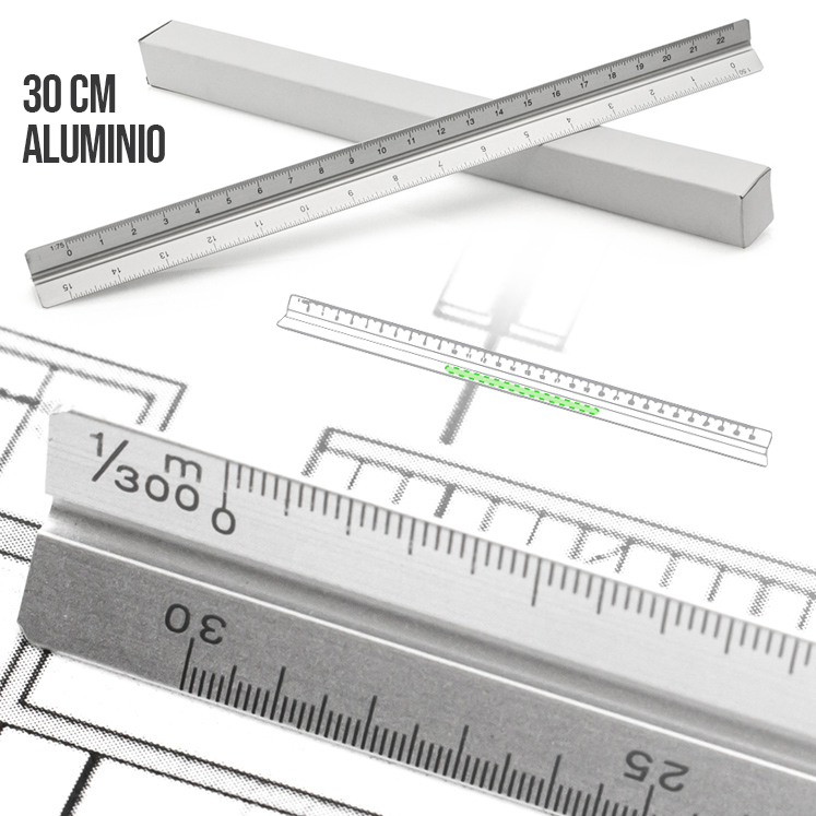 Escalímetro de aluminio en diseño triangular de 30cm. Escalas 1:20/1:25/1:50/1:75/1:100. Con cara lisa para marcaje. Presentado en caja individual. 30 cm. Escalas: 1:20, 1:25, 1:50, 1:75, 1:100