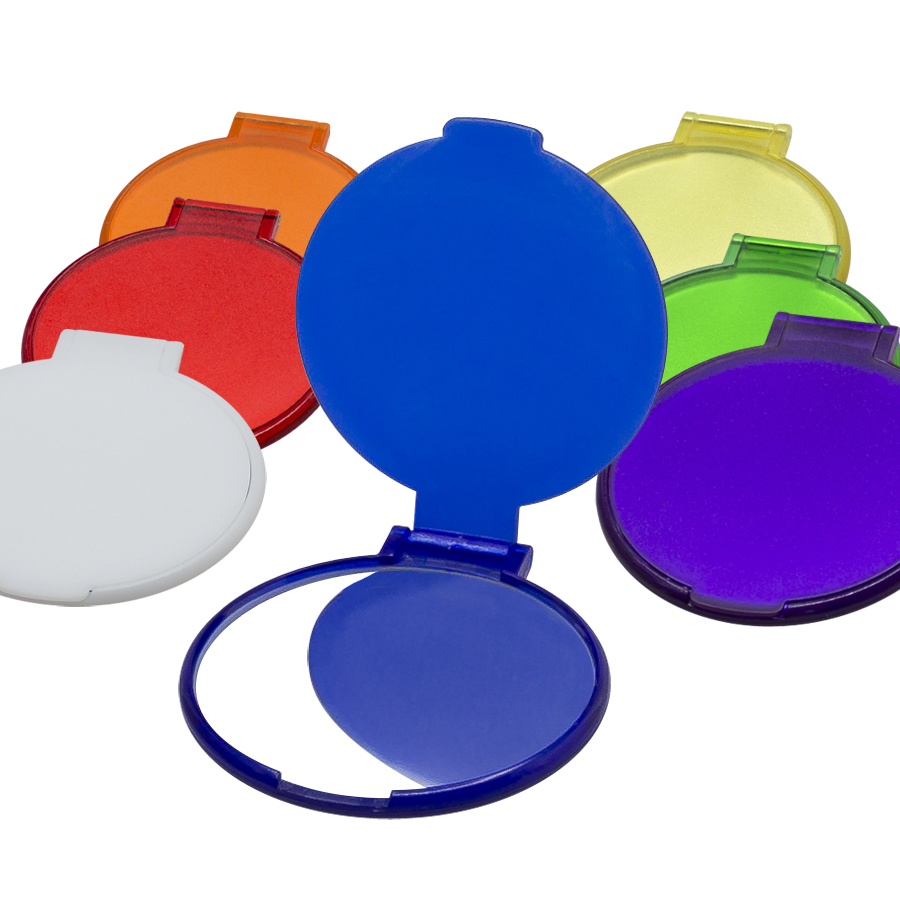 Espejo redondo de bolsillo, de plástico ABS, con tapa. Presentación individual en bolsita de polipropileno.