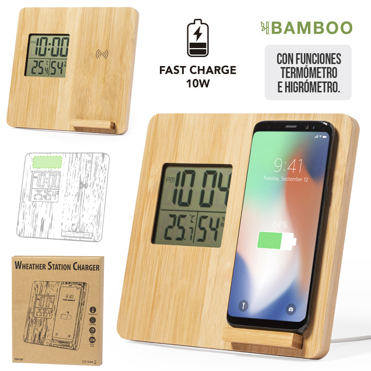 Estación meteorológica de línea nature, con cargador inalámbrico de carga 10W integrado. Fabricada en bambú pulido y con funciones termómetro e higrómetro. Incluye cable de carga Micro USB de 1m. Compatible con dispositivos equipados con tecnología de carga inalámbrica. Reloj alimentación a pilas (de botón incluida) y presentado en atractiva caja de diseño eco. Disponible manual de instrucciones en español e inglés. Inalámbrico 10W. Pila Botón Incluida