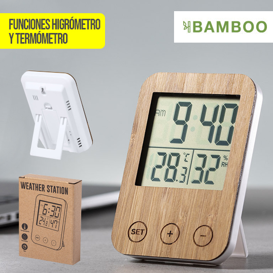 Estación meteorológica de línea nature con frontal en bambú. Funciones higrómetro y termómetro. Alimentación a pilas (2xAAA no incluidas) y presentado en atractiva caja de diseño eco. 2 Pilas AAA No Incluidas