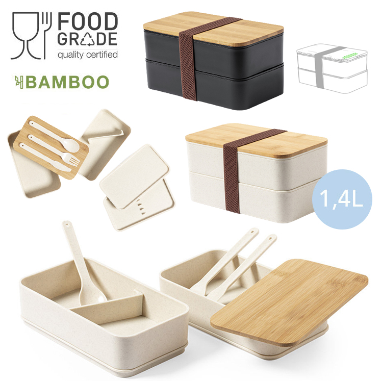Fiambrera de 1,4l en resistente material PP veteado libre de BPA, con tapa de bambú. Dos compartimentos, cada uno de 700 ml de capacidad. Compartimento interior con tenedor, cuchara y cuchillo. Incluye cinta de seguridad exterior. Certificación Food Grade, garantizando la seguridad cuando los alimentos entran en contacto con el material usado para fabricar el producto. 2 Compartimentos 700 ml