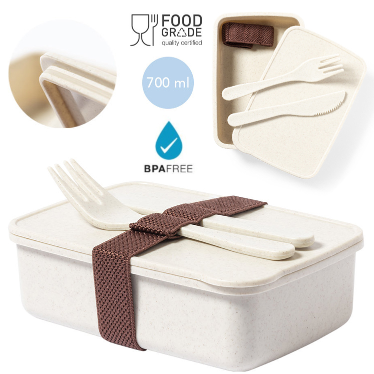 Fiambrera fabricada en PP veteado libre de BPA. De 700ml de capacidad, incluye cinta elástica de seguridad con tenedor y cuchillo. Certificación Food Grade, garantizando la seguridad cuando los alimentos entran en contacto con el material usado para fabricar el producto. 700 ml
