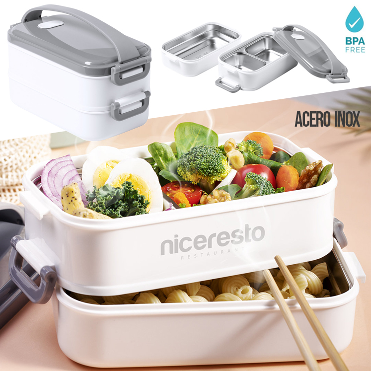 Fiambrera térmica de 850ml de capacidad. Fabricada en acero inox y PP, libre de BPA. Incluye 2 compartimentos independientes con bandejas en acero inox y cierre hermético, de 500ml y 350ml de capacidad respectivamente. Ideal para una correcta conservación del calor, con posibilidad de prolongación añadiendo agua caliente. 2 Compartimentos 350 y 500 ml
