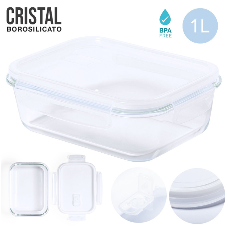 Fiambrera de 1L de capacidad, libre de BPA. Fabricada en cristal de borosilicato, ofreciendo una alta resistencia y durabilidad. Reutilizable, con tapadera hermética en acabado translúcido y válvula en la tapa con sistema de apertura y cierre para circulación del aire. Presentada en atractiva caja individual de diseño. 1 L