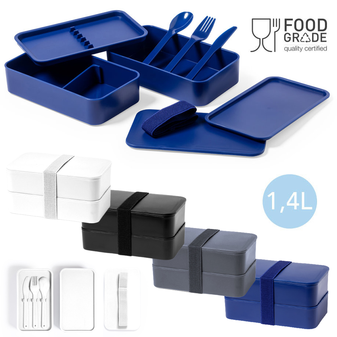 Fiambrera de 1,4 l de capacidad, fabricada en PP libre de BPA. Dos compartimentos, cada uno de 700 ml de capacidad. Compartimentos interiores con tenedor, cuchara, cuchillo y separadores. Disponible en variada gama de colores, con cinta elástica de seguridad a juego. Certificación Food Grade, garantizando la seguridad cuando los alimentos entran en contacto con el material usado para fabricar el producto. 2 Compartimentos 700 ml
