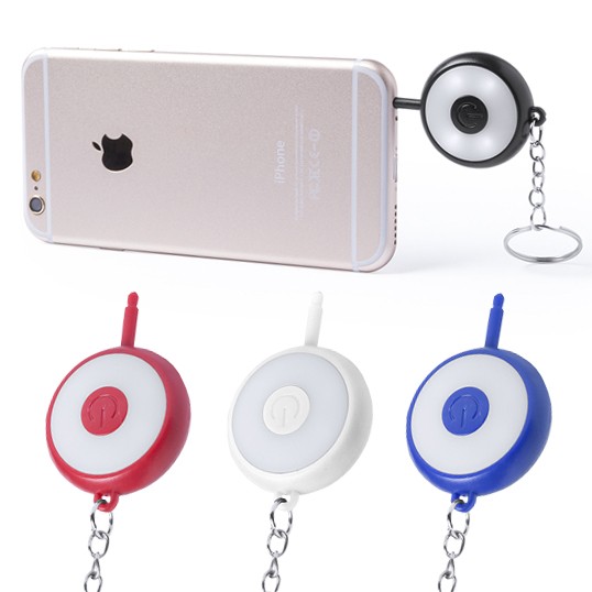 Módulo de flash de 4 ledes compatible con cualquier tipo de dispositivo móvil, con accesorio de anclaje a smartphone tipo jack de 3,5mm, especialmente diseñado para la captura de vídeos. Con accesorio llavero para transporte. Pilas de botón incluidas. 4 Ledes. Pilas Botón Incluidas