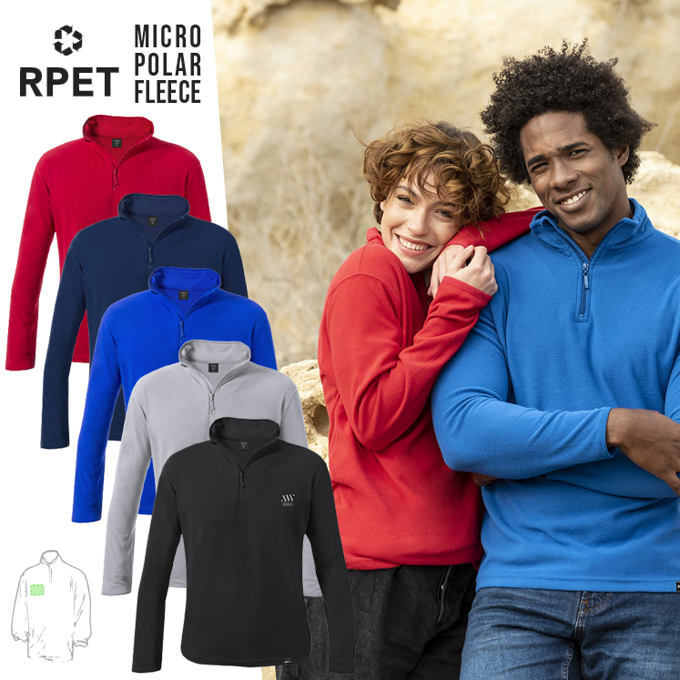 Chaqueta unisex en cálido y suave micro polar fleece RPET de 155g/m2 con tratamiento anti-pilling. Material elaborado a partir de plástico reciclado, para así fomentar la reutilización de residuos plásticos y contribuir a la sostenibilidad del planeta. Con distintivo eco en dobladillo inferior de la prenda. Cuello con cierre de cremallera y cintura elástica. Disponible en tallas S, M, L, XL, XXL. Tratamiento Anti-Pilling