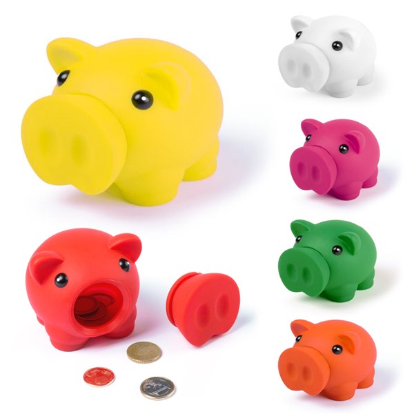 Hucha cerdito con suave cuerpo de acabado goma en vivos colores.