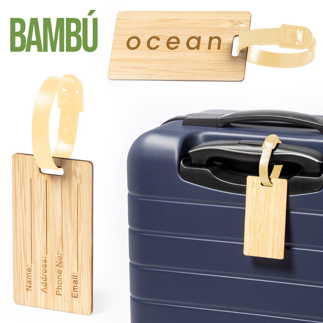 Identificador para maletas de línea nature fabricado en bambú. Cinta de acople con cierre de hebilla y datos de identificación en inglés, con cara opuesta lisa para marcaje.