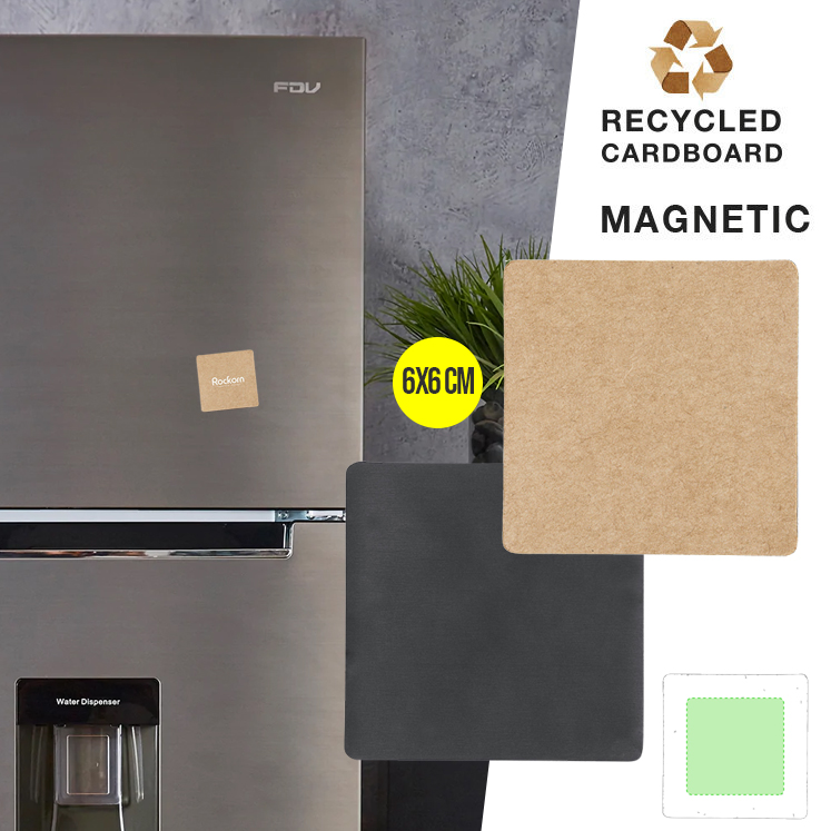 Imán de 6x6cm en cartón reciclado de 185g/m2, con esquinas redondeadas.