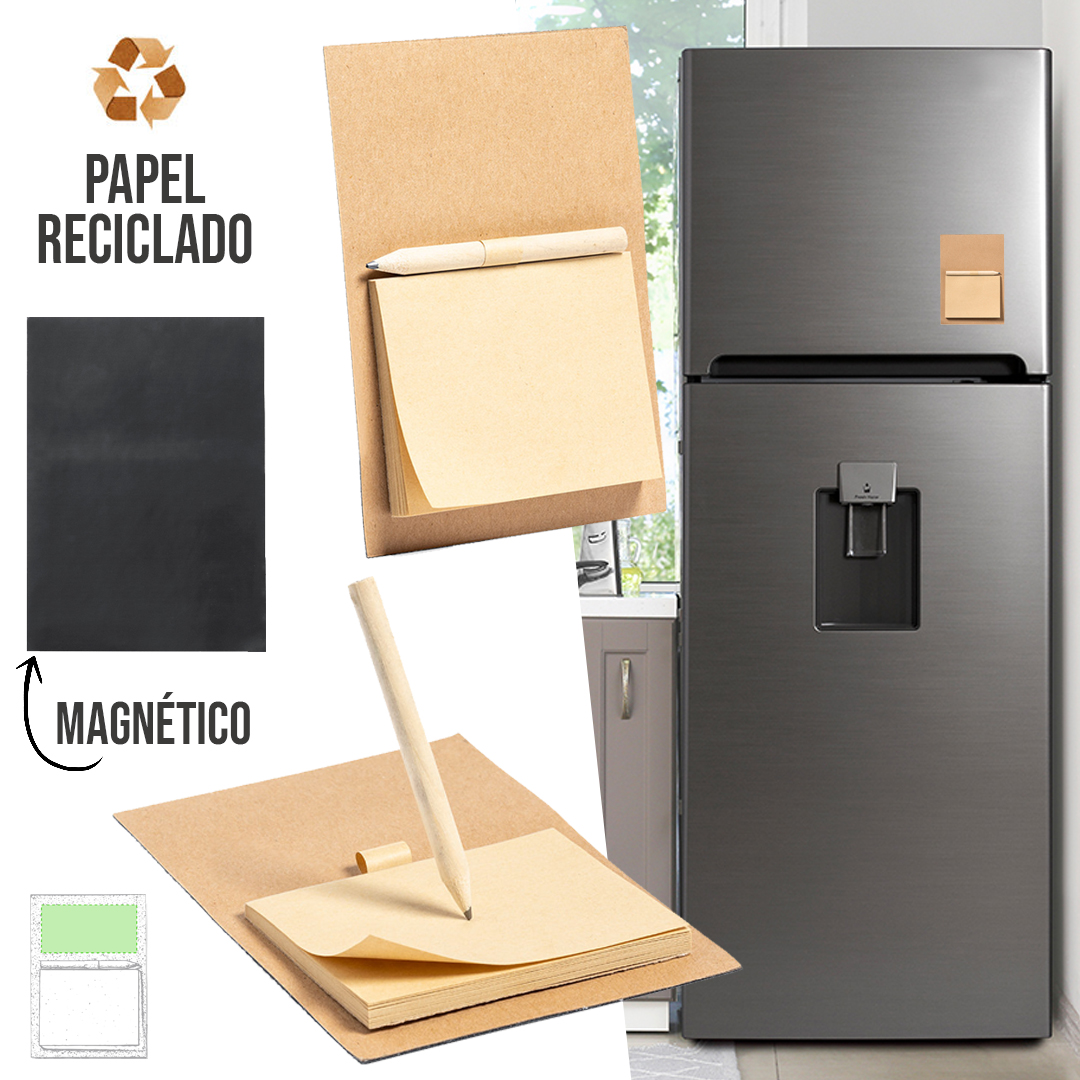 Imán para notas de línea nature. Fabricado en resistente papel reciclado, incluye minilápiz de madera y bloc de notas con 40 hojas lisas en color crema. Bloc 40 Hojas. Lápiz Incluido