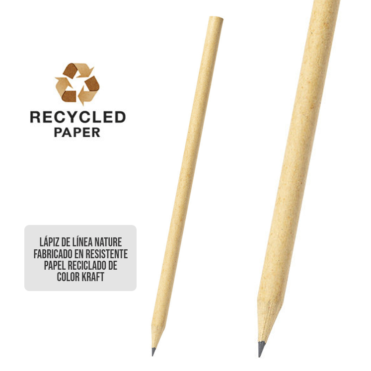 Lápiz de línea nature fabricado en resistente papel reciclado de color kraft. Con mina negra y punta afilada.