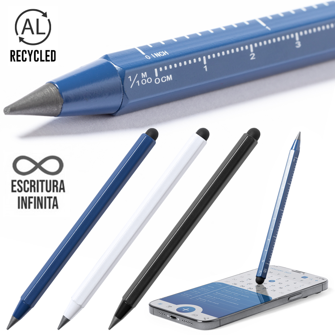 Lápiz eterno multifunción fabricado en aluminio reciclado. Funciones lápiz, puntero táctil y regla, con medidas en centímetros (11) y pulgadas (4). Reutilizable y con escritura infinita, para así usar siempre el mismo lápiz y no generar residuos. Con distintivo aluminio reciclado y disponible en variada gama de colores.El aluminio reciclado es un material con posibilidades de reciclaje casi infinitas, sin perder sus propiedades originales y consumiendo menos energía en este proceso. 3 Funciones