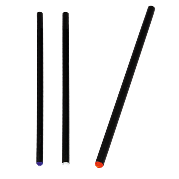 Elegante lápiz de madera negra con mina a juego y accesorios en vivos colores. Punta sin afilar.