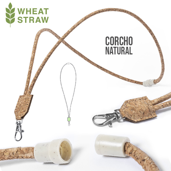 Lanyard de línea nature fabricado en corcho natural de acabado tubular. Con cierre de seguridad para cuello en caña de trigo/PP y mosquetón metálico. Incluye pastilla central en corcho para impresión. Cierre Seguridad
