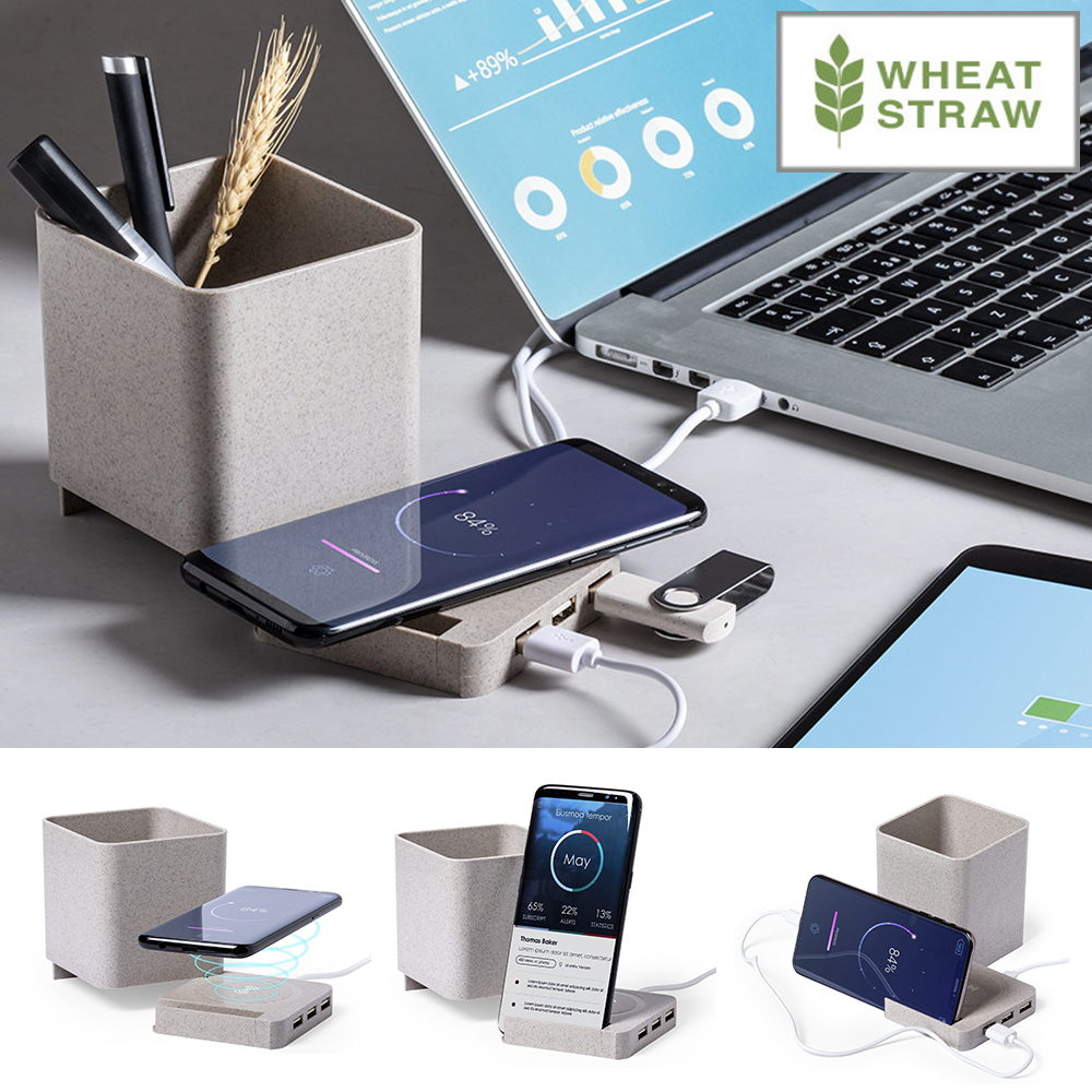 Lapicero multifunción 4 en 1 de línea nature. Carcasa en caña de trigo, para así fomentar la utilización de materias primas naturales y reducir las emisiones contaminantes. Con funciones lapicero, soporte para smartphone, cargador inalámbrico y puerto USB (3xUSB 2.0). Compatible con smartphones con tecnología de carga inalámbrica, incluye cable micro USB en color blanco de 1 metro de largo. Presentado en atractiva caja de diseño eco. Disponible manual de instrucciones en español e inglés. Inalámbrico 5W. 3 Puertos. USB 2.0