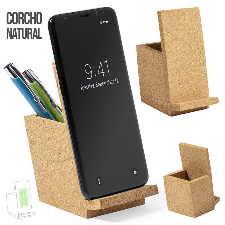 Lapicero de línea nature con soporte para smartphone integrado. Fabricado en corcho, para así fomentar el uso de las materias primas naturales, y presentado en atractiva caja de diseño eco.