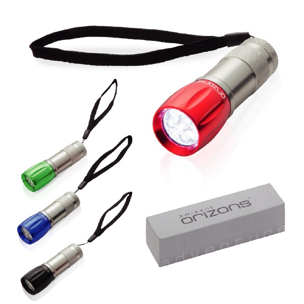 Linterna de Orizons de 9 ledes de alto poder de iluminación. Con resistente cuerpo en aluminio de diseño bicolor con mango antideslizante, pulsador protegido con recubrimiento de resistente goma y cinta de transporte. Alimentación a pilas: 3xAAA no incluidas. Presentada en atractiva caja de diseño con logotipo de la marca. 9 Ledes. 30 Lúmenes. 3 Pilas AAA No Incluidas